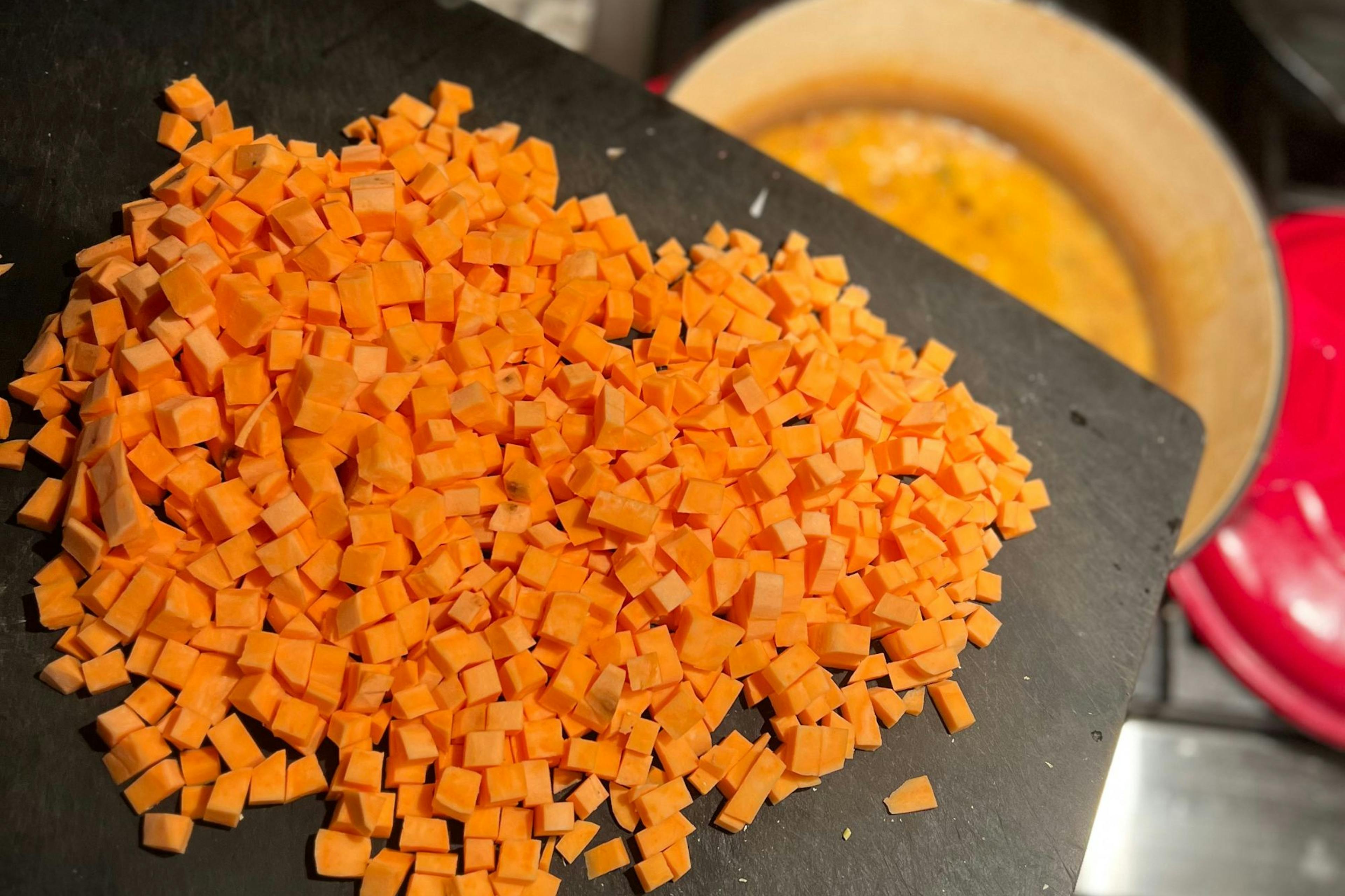 This recipe recommends chopping the sweet potatoes into ¼ inch cubes. Doing so creates a texture that mimics rice or lentils, but it’s not absolutely necessary. Bigger chunks of sweet potatoes or your preferred squash could be used (such as butternut or acorn), but you’ll need to increase the simmer time until the potatoes are fork-tender.